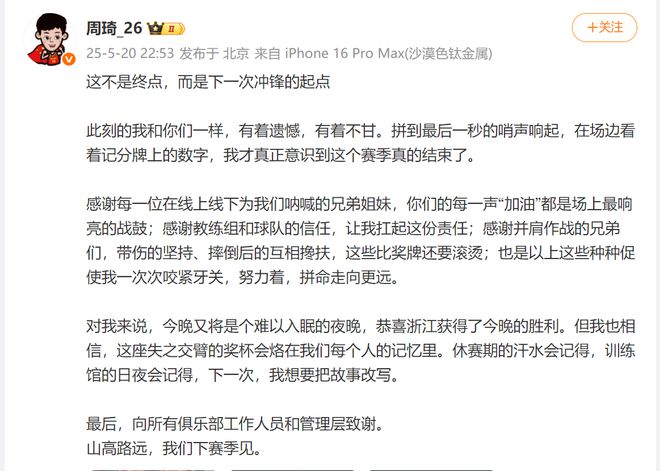 同时周琦的一席话也很真诚,他表示这不是终点,而是下一次冲锋的起点。休赛期的汗水会记得,训练馆的日夜会记得,下一次,我想要把故事改写。山高路远,我们下赛季见。